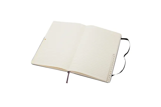Net als zijn beroemde zwarte tegenhanger, beschikt dit notitieboek over een kartonnen kaft van polypropulen met afgeronde hoeken, zuurvrij papier, een bladwijzer, een elastische sluiting en een uitbreidbaar binnenvak met een tekst over de geschiedenis van Moleskine.