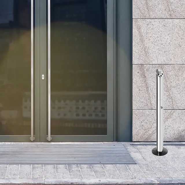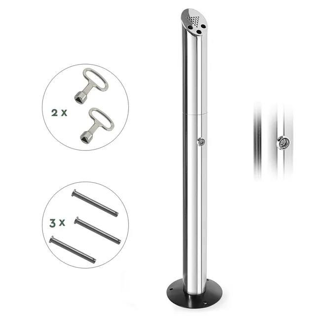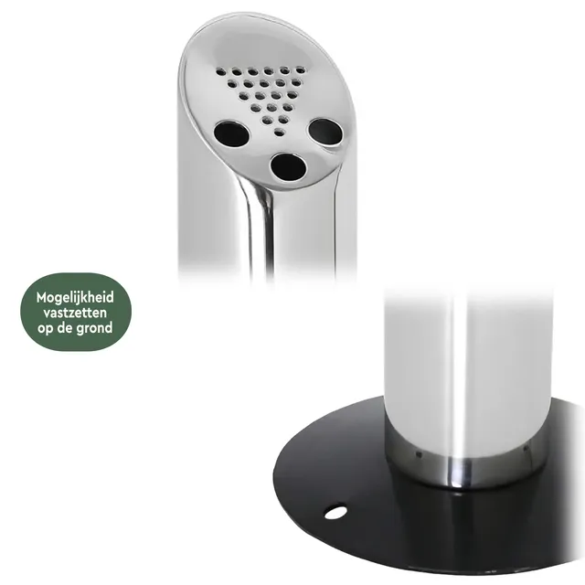 Deze rookpaal, of peukenzuil, heeft een luxueuze en moderne uitstraling en is gemaakt van geborsteld hoogwaardig RVS (Stainless Steel 304). Door de hoge mate van corrosiebestendigheid van dit materiaal kan hij weer en wind doorstaan.
