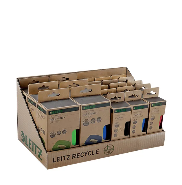 Nietmachines en perforators in recyclebare verpakkingen met kijkvenster zodat de gebruiker eenvoudig de juiste kleur kiest.