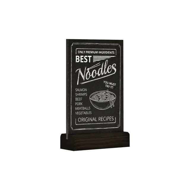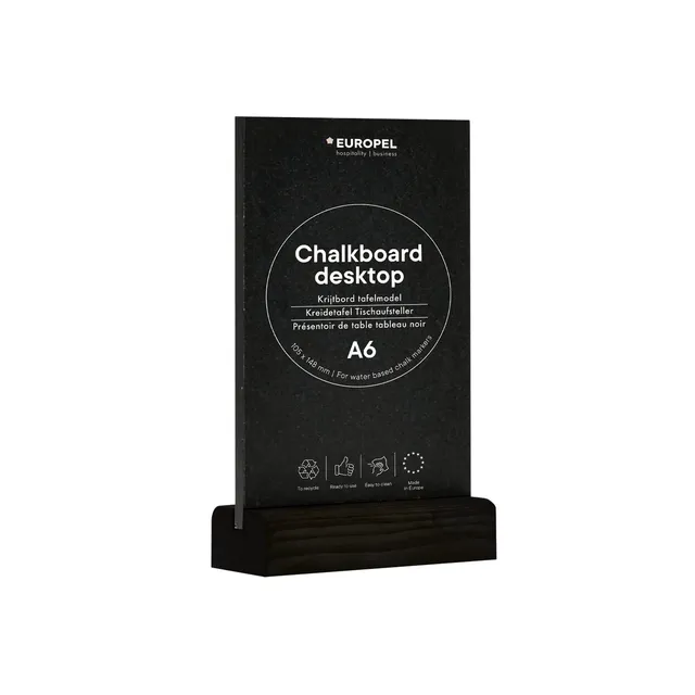 Krijtbord tafelmodel, met een voet van dennenhout, mat zwarte afwerking.