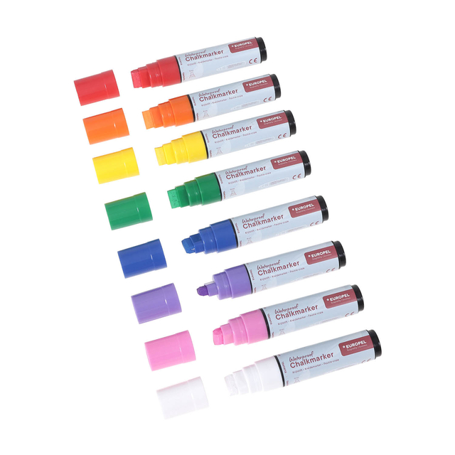 Deze set bevat 8 levendige kleuren: rood, paars, blauw, oranje, roze, geel, groen en wit.