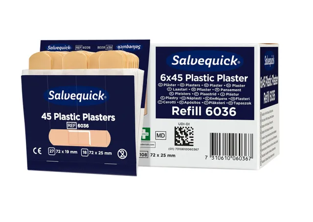 Salvequick navulling plastic (6036) met 6 kaarten à 45 pleisters voor een Salvequick dispenser.