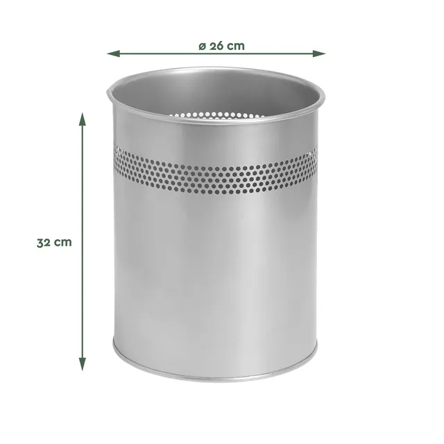 Dé perfecte oplossing voor al je rondslingerende papier, propjes en afval. De BRASQ Papierbak is een ideale papier- en/of afvalbak. Zorg een schoon leef- en werkmilieu! Deze praktische en handzame BRASQ Papierbak past in elk interieur. Zet hem onder je bureau en gooi nooit meer mis. De BRASQ Papierbak, of prullenbak, zal niet misstaan op kantoor, studeerkamer, thuiswerkplek, hotelkamer of winkel en neemt door zijn compacte design weinig ruimte in. Gemaakt van een stevig metaal met aan de bovenzijde een elegante perforatierand. De papierbak heeft een inhoud van 15 liter, een dikte van 0,4mm en weegt slechts 0,9kg, waardoor hij makkelijk verplaatsbaar is. De prullenmand kan ook als afvalbak gebruikt worden en is voorzien van een sterke epoxy laklaag. De poedercoating is van hoogwaardige kwaliteit. Deze bin heeft een doorsnede van Ø26cm en is 32cm hoog. Deze papierbak is een uitkomst in elke woon- of werkomgeving. Dit product is voor 100% recyclebaar.
