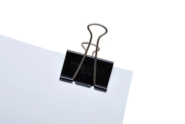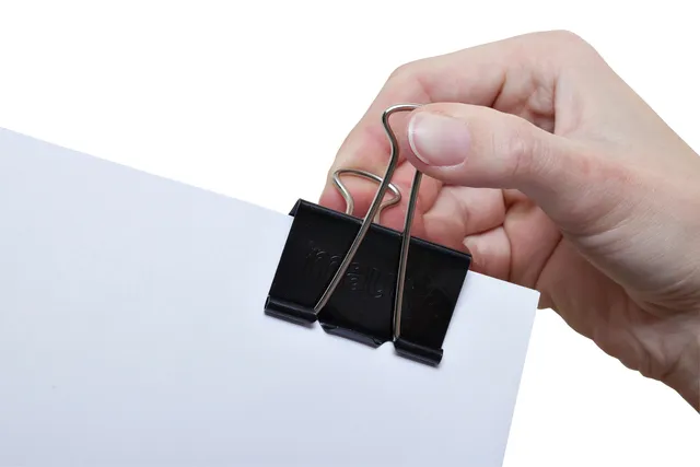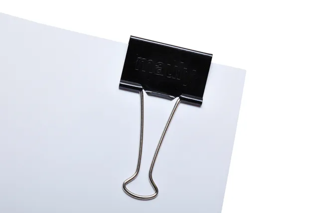 Open de papierklem door de metalen beugels naar achteren te klappen en samente knijpen, sluiten van de klem door de beugels weer los te laten en eventueelnaar voren klappen.