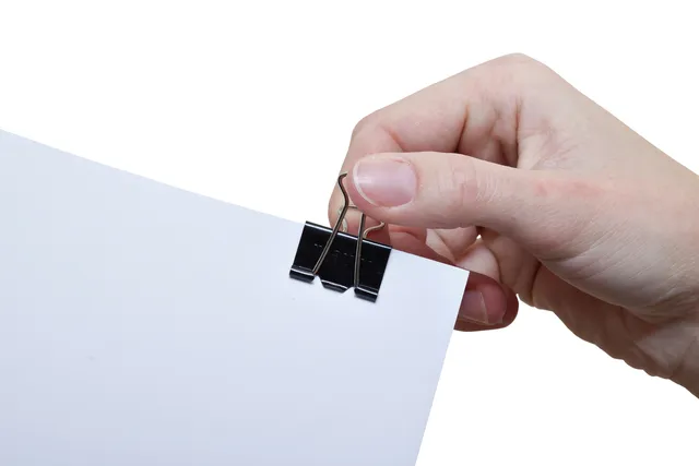 Open de papierklem door de metalen beugels naar achteren te klappen en samente knijpen, sluiten van de klem door de beugels weer los te laten en eventueelnaar voren klappen.