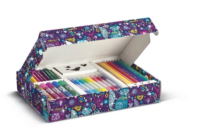 Complete glitter-kleurset met maarliefst 31 verschillende Maped-producten in een mooie opbergdoos.
