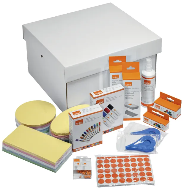 Inclusief 14 veelkleurige whiteboard markers, 10 whiteboard magneten van 24mm, 10 magneten van 32mm, 2 whiteboard wissers, reinigingsspray, 2 raster tapes, 100 spelden, 750 gekleurde moderation kaarten en 1000 zelfklevende cirkels.